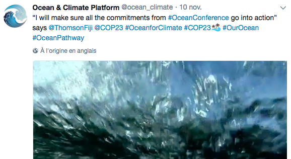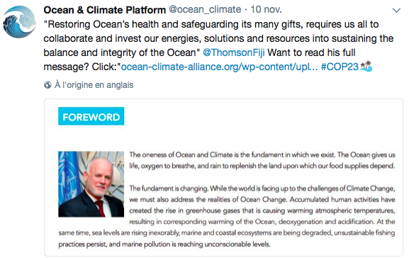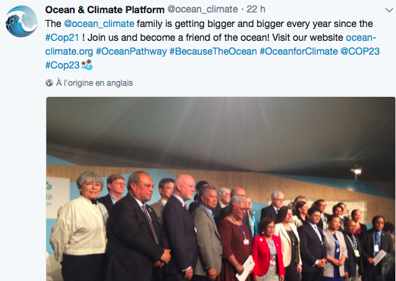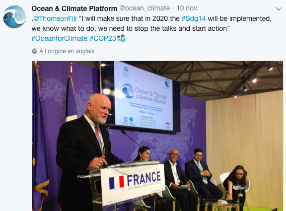 It is with this objective in mind that Fiji decided to bring this initiative to the COP23 center stage, in order to initiate a new kind of ocean governance. This partnership, supported and co-organised by the Ocean and Climate Platform, aims to involve the decision-makers by promoting the adhesion of Parties and stakeholders to a collective effort to bring ocean into UNFCCC processes and sustain action.
