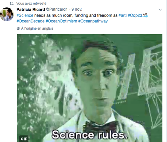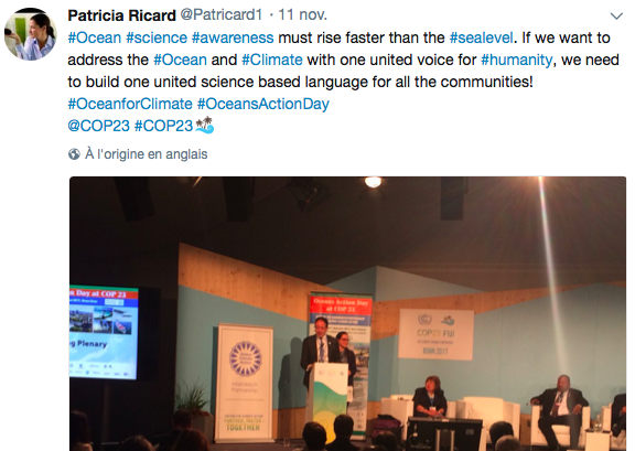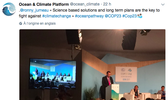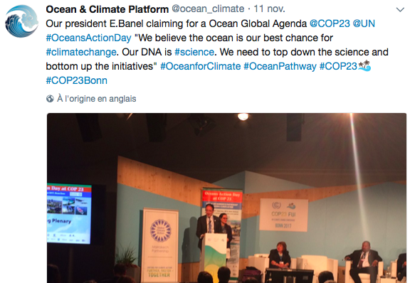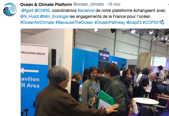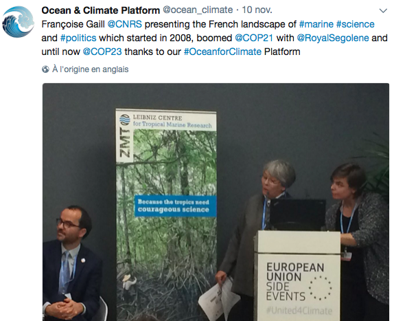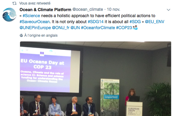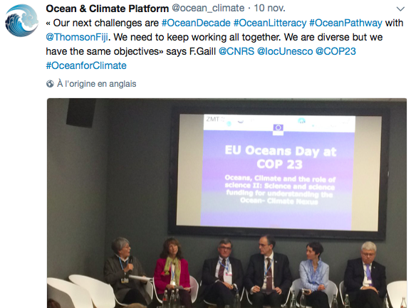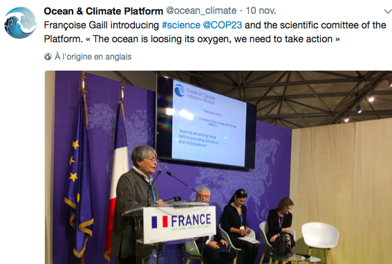 Science also played an important role during this COP23. During the Oceans & Coastal Zones GCA Day, a session organized by the Intergovernmental Oceanographic Commission of UNESCO, involving Françoise Gaill from OCP, was devoted to science, with an analysis of the IPCC report on ocean, highlighting the need of science in the development of the ocean policies and the funding required to implement them.