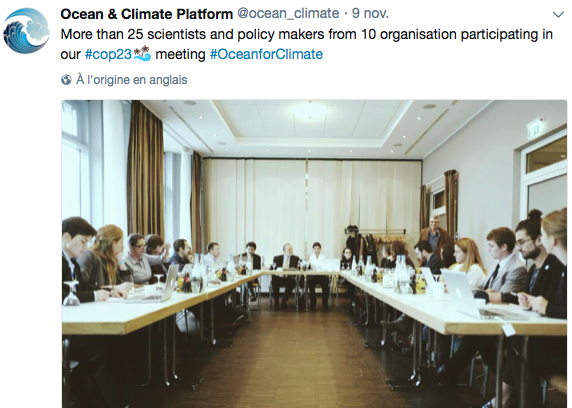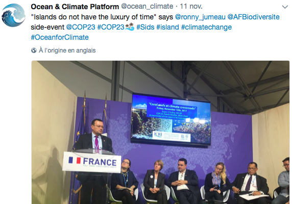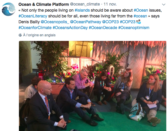 The ocean and climate community has been actively mobilized within the Bonn Zone, (zone of the civil society). Indeed, two “oceans days” have been organized during COP23. The first one lead by the European Union took place on 10 November, and the second one, the Oceans & Coastal Zones Global Climate Action (GCA) Day, has been organized by the Global Ocean Forum (GOF) and its partners (including the OCP) on 11 November.