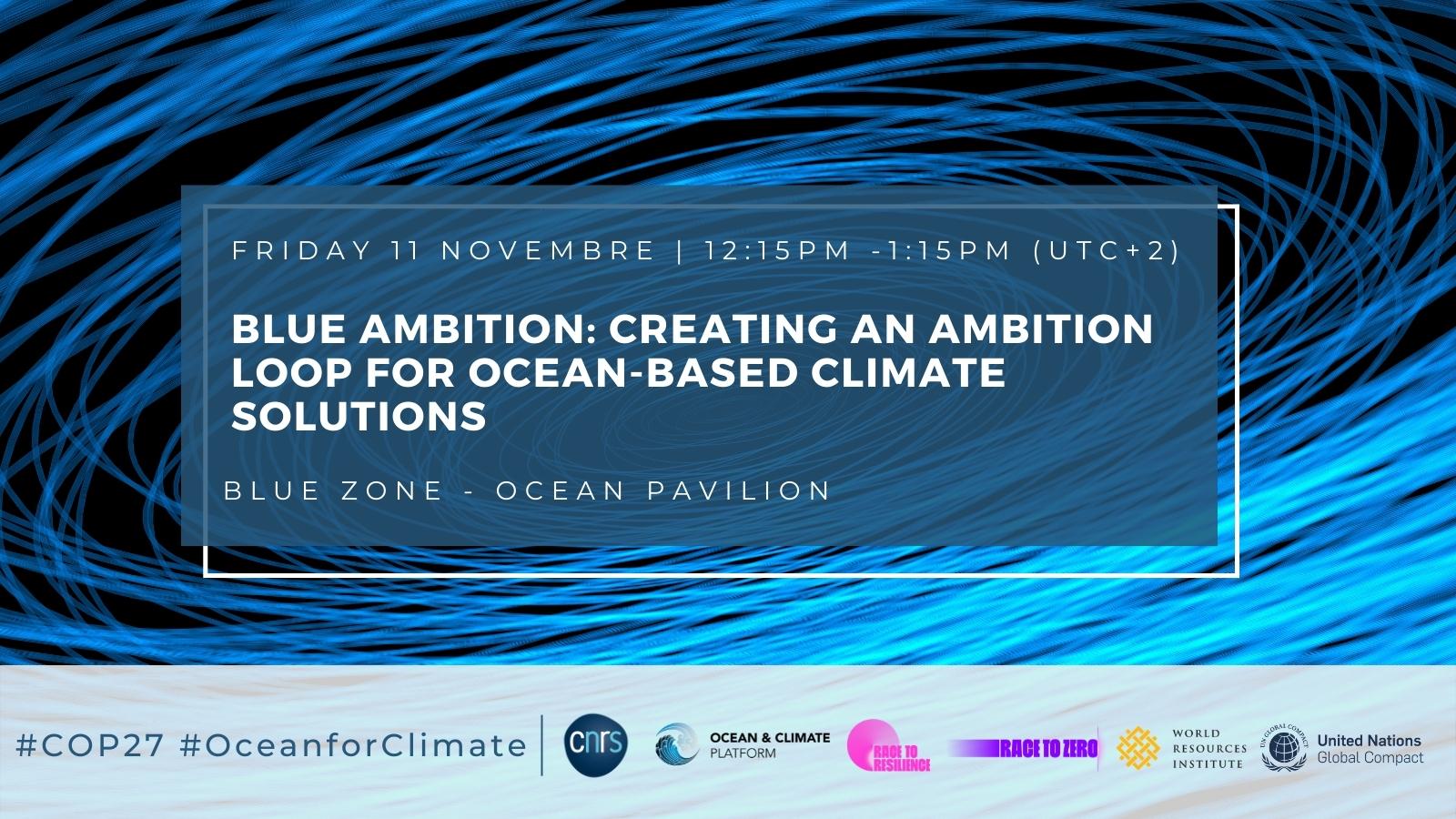 Vendredi 11 novembre, la Plateforme Océan & Climat, le World Resources Institute, Rare, les High-Level Climate Champions et le UN Global Compact organisent un événement de haut niveau sur le thème “Blue Ambition: Creating an Ambition Loop for Ocean-based Climate Solutions” (Ambition bleue : encourager les solutions pour le climat issues de l’océan), de 12h15 à 13h15 au Pavillon Océan. S’inscrivant dans l’ambition “du passage à l’action” de cette COP et en amont du Bilan Mondial (GST), cet événement aura pour objectif d’encourager les gouvernements à mieux intégrer l’océan dans leurs Contributions Déterminées au niveau National et à mobiliser les acteurs non-étatiques autour de l’action pour l’océan dans le but d’accélérer l’atténuation et l’adaptation au changement climatique.